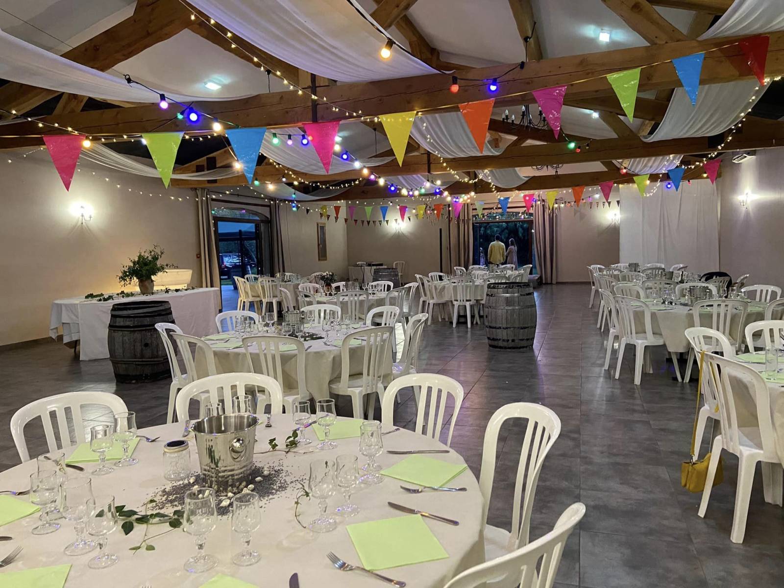 Nous mettons à votre disposition tables et chaises, ainsi qu’une grande cuisine équipée comprenant deux frigos professionnels, un four, un congélateur et un micro-ondes, pour faciliter l’organisation de votre repas. Libre à vous de choisir le traiteur qui correspond à vos goûts et à votre budget.